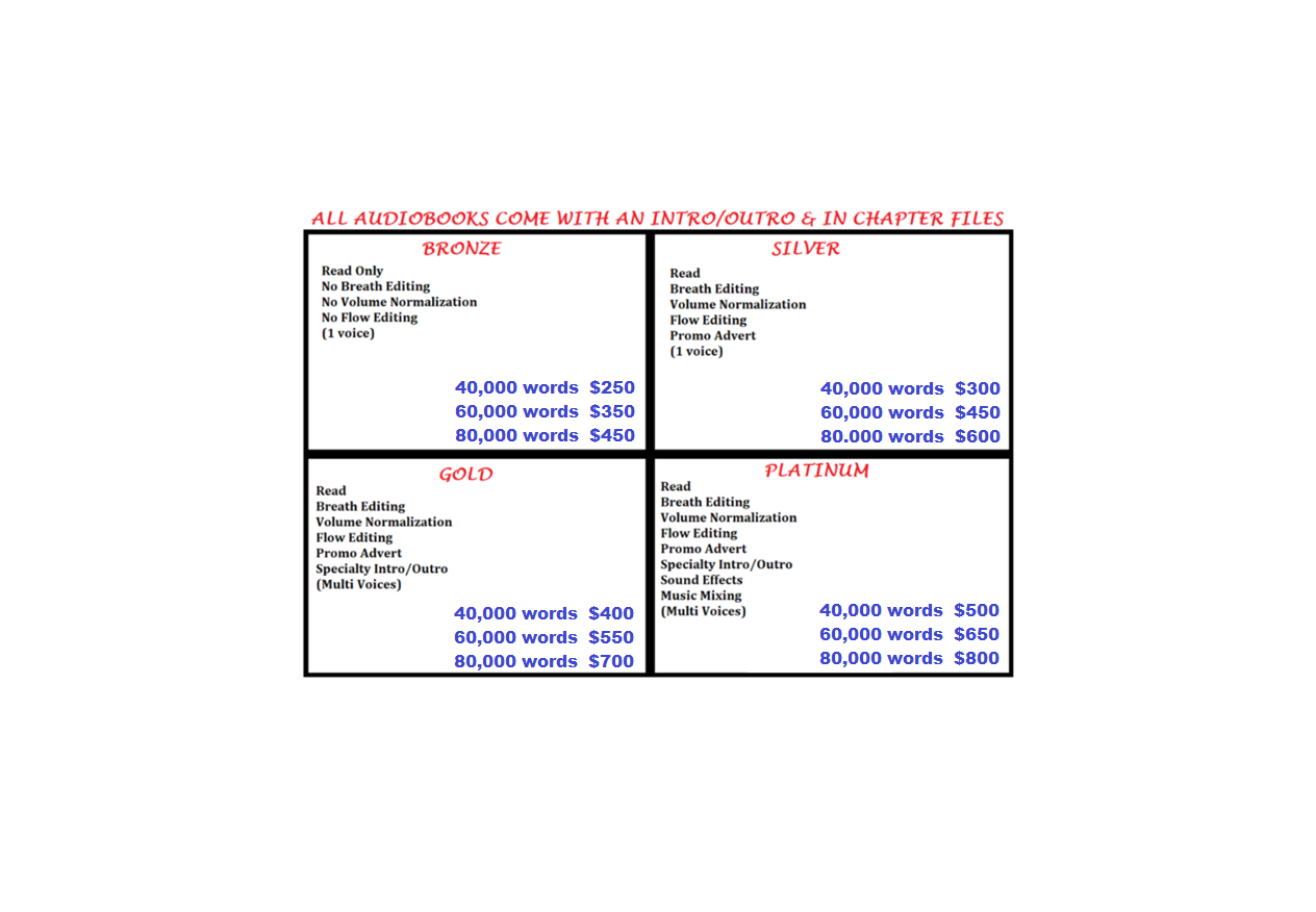 Note* A 60,000 word Audiobook takes around 35 hours of work (Based on a Silver Package)